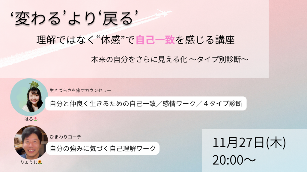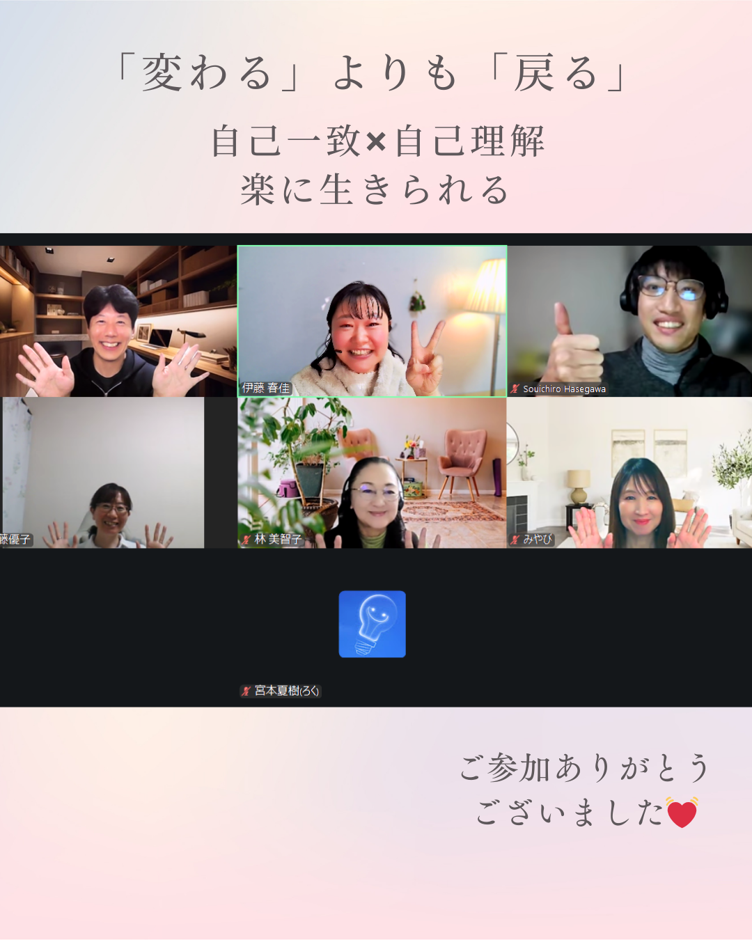 前半は私が「自己一致」して楽に生きることについて解説と、体感ワーク「気持ちを取り出す」ワークを実施しました。