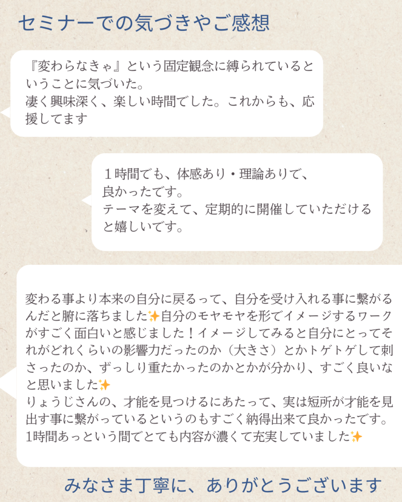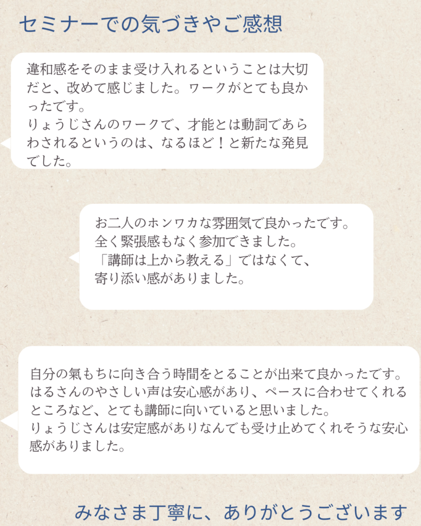みなさまワークに取り組み、ご自身と向き合う時間にしていただいたようです。